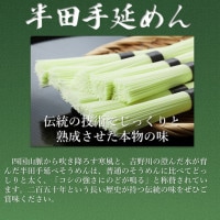 丹誠込めて練り上げた麺生地に栄養たっぷりの稲若葉を練りこみました。二百年余りの歴史を持つ、半田手延べそうめんは麺たい(麺線が太い)タイプで「こし」が強くのどをならします。四国吉野川の流水ときれいな空気が育んだおいしいそうめんです。ほんのり緑色、稲の香りがとても上品です。3束×10袋入り